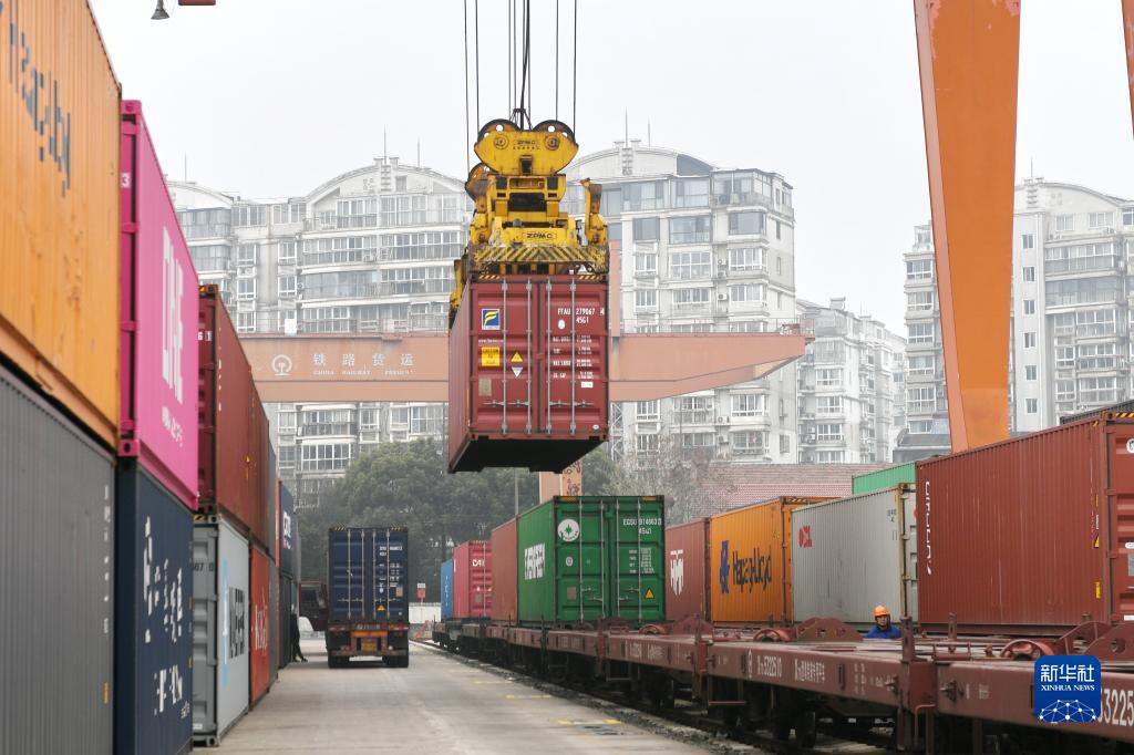 2月8日,在常州站鐵路貨場(chǎng),裝載新能源汽車(chē)的集裝箱被裝上海鐵聯(lián)運班列。