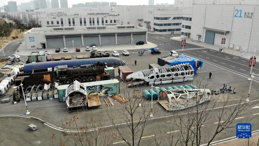 青島東方影都影視產(chǎn)業(yè)園置景車(chē)間外堆放的部分影視道具(2月8日攝,無(wú)人機照片)。