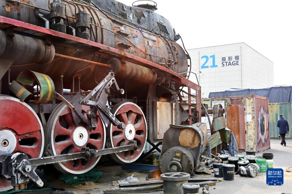 2月8日,青島東方影都影視產(chǎn)業(yè)園置景車(chē)間外的一個(gè)道具火車(chē)頭。
