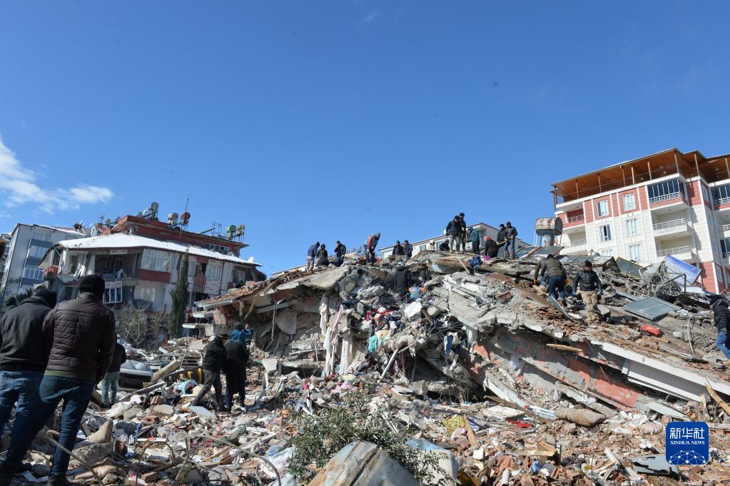 2月8日,在土耳其阿德亞曼省貝斯尼,救援人員在地震廢墟搜救。
