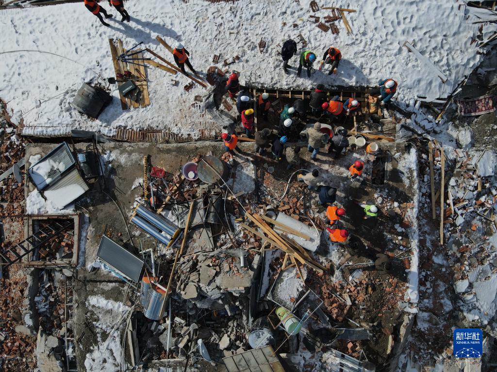 2月8日,在土耳其阿德亞曼省貝斯尼,救援人員在地震廢墟搜救(無(wú)人機照片)。