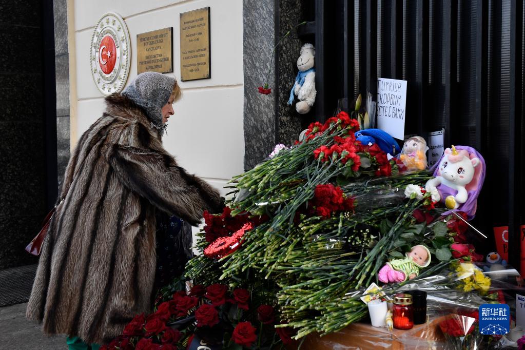 2月8日,莫斯科市民在土耳其駐俄羅斯大使館外獻花悼念地震遇難者。
