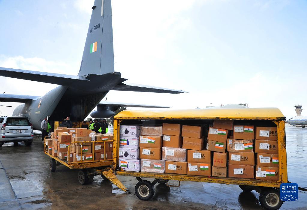 2月8日,在敘利亞大馬士革的機場(chǎng),工作人員卸載印度提供的救援物資。