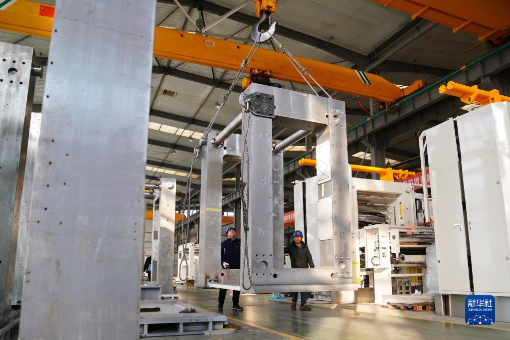 2月6日,在位于河北邢臺經(jīng)濟開(kāi)發(fā)區的邢臺納科諾爾精軋科技股份有限公司,工人在生產(chǎn)車(chē)間吊裝配件。