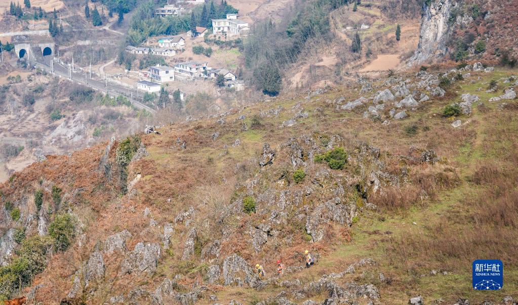 六盤(pán)水工電段職工在滬昆鐵路茨沖至濫壩區段登山巡檢(2月8日攝)。