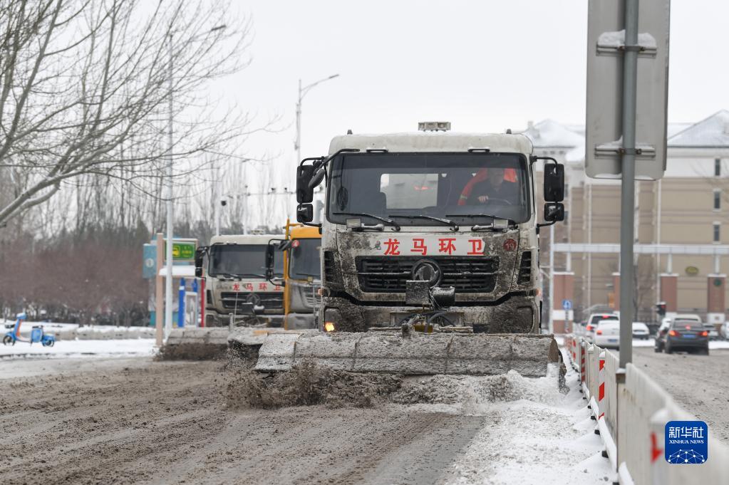 當日,內蒙古鄂爾多斯市迎來(lái)降雪天氣,路面出現積雪。當地環(huán)衛部門(mén)組織人力和大型機械清掃路面,保障市民出行安全。