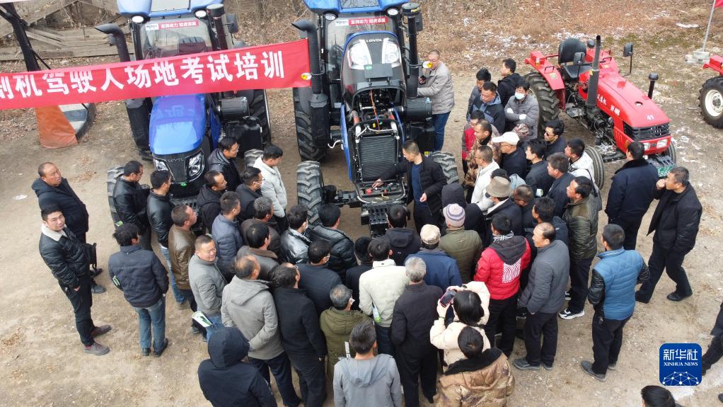 2月9日,在甘肅省定西市隴西縣農機服務(wù)中心,農機手在接受培訓(無(wú)人機照片)。