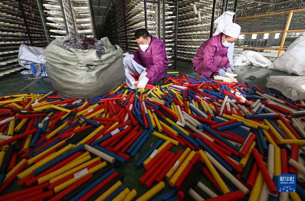 兩位員工在圣源地毯集團有限公司生產(chǎn)車(chē)間內分揀回收紗線(xiàn)筒(2月1日攝)。