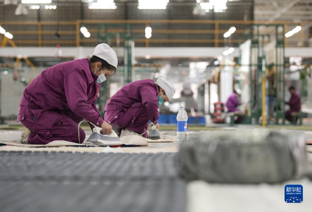 女工們在圣源地毯集團有限公司生產(chǎn)車(chē)間進(jìn)行地毯加工(2月4日攝)。