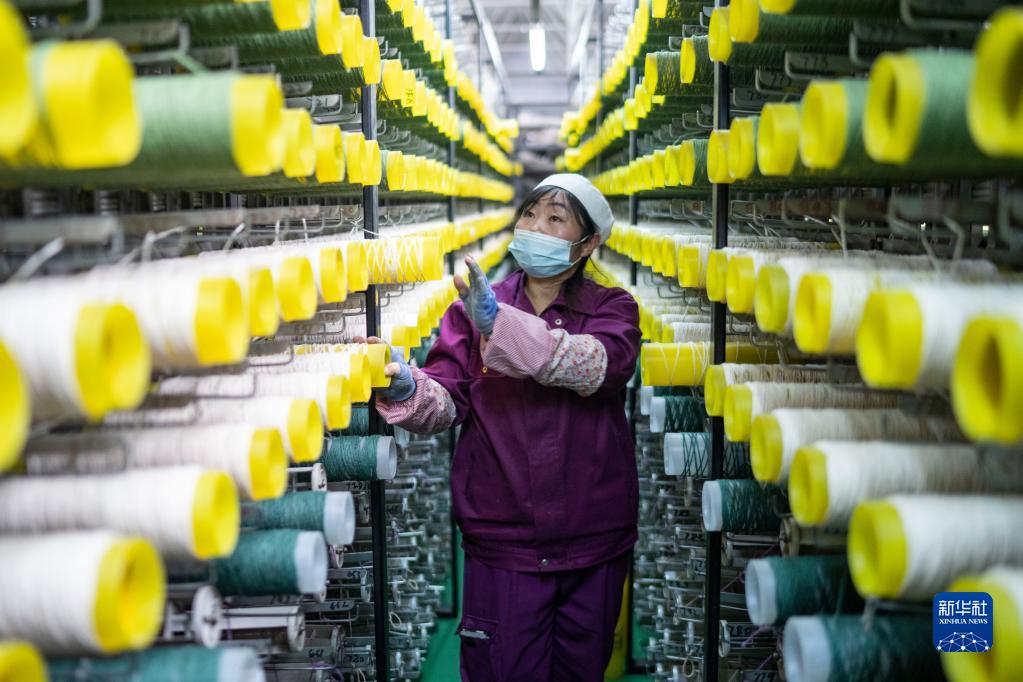 在青海省西寧市圣源地毯集團有限公司生產(chǎn)車(chē)間,操作工檢查紗線(xiàn)筒(2月1日攝)。