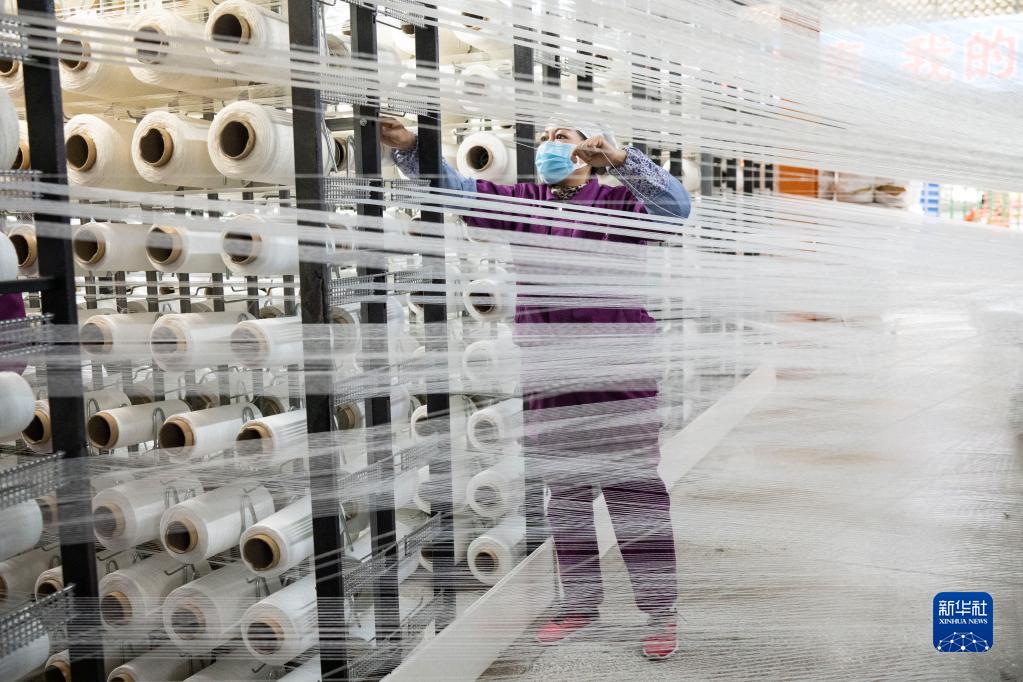 在青海省西寧市圣源地毯集團有限公司生產(chǎn)車(chē)間,操作工梳理纏繞的紗線(xiàn)(2月1日攝)。