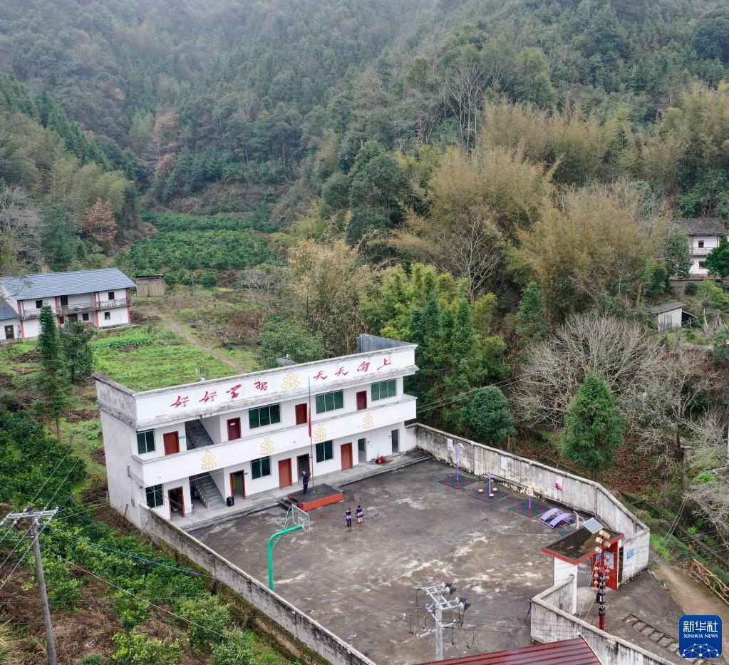 2月8日,鄧煙發(fā)和學(xué)生在操場(chǎng)舉行升旗儀式(無(wú)人機拍攝)。