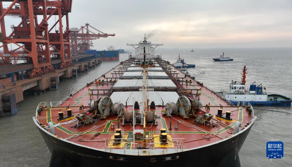 2月9日,一艘輪船在拖輪協(xié)助下向唐山港曹妃甸港區礦石碼頭靠泊(無(wú)人機照片)。