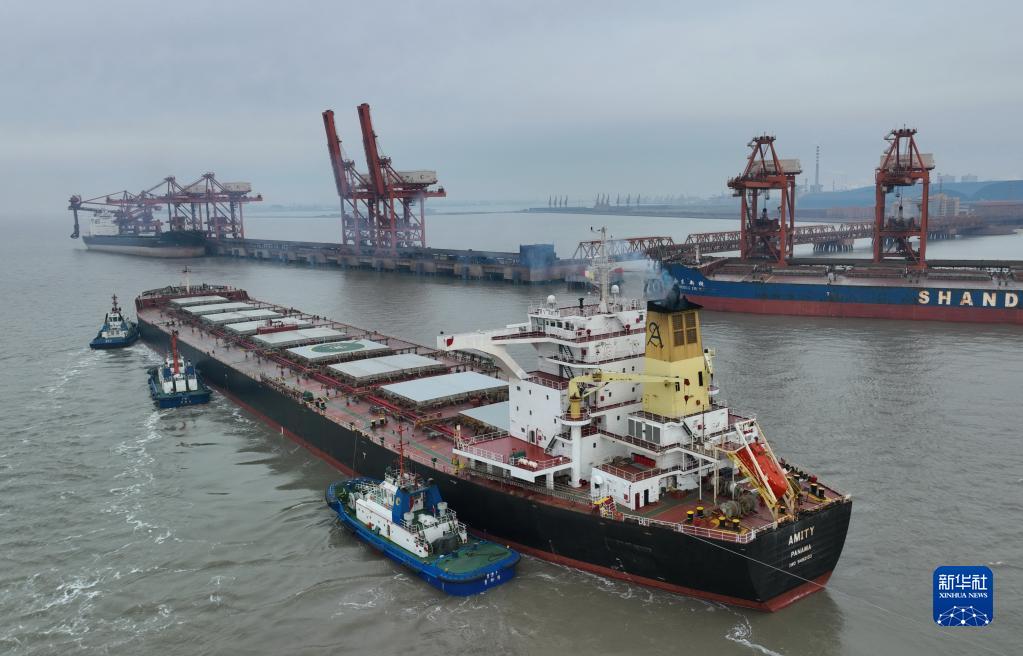 2月9日,一艘輪船在拖輪協(xié)助下向唐山港曹妃甸港區礦石碼頭靠泊(無(wú)人機照片)。