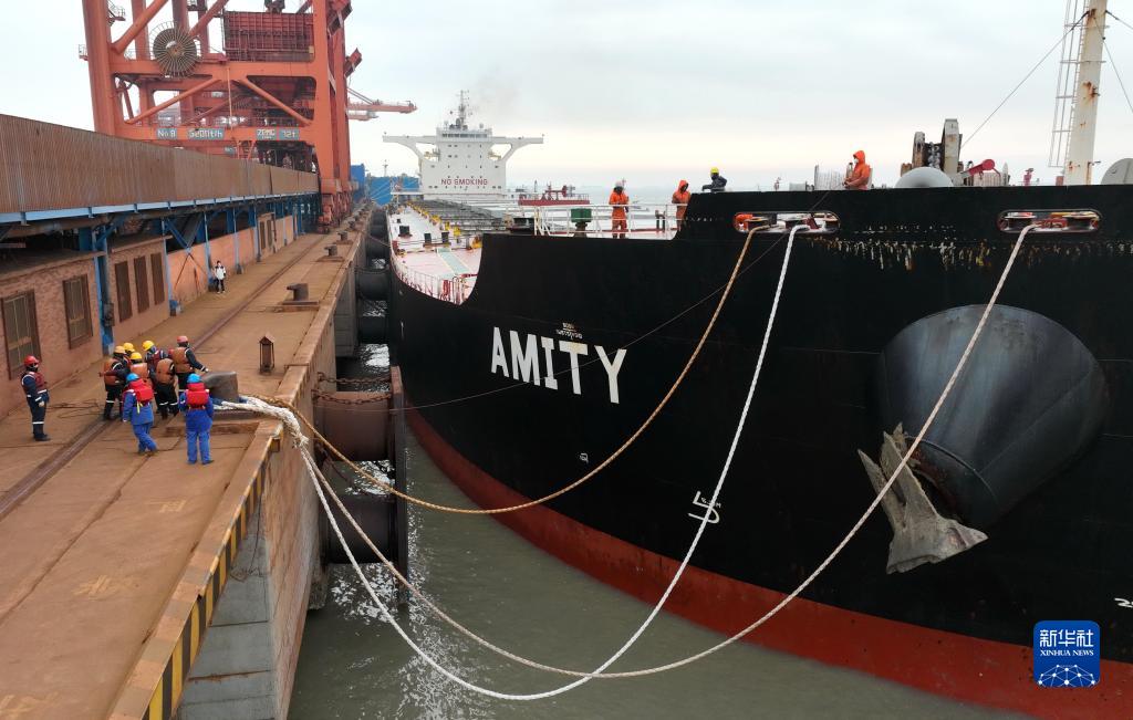 2月9日,工人在唐山港曹妃甸港區礦石碼頭為剛靠泊的輪船系纜繩(無(wú)人機照片)。