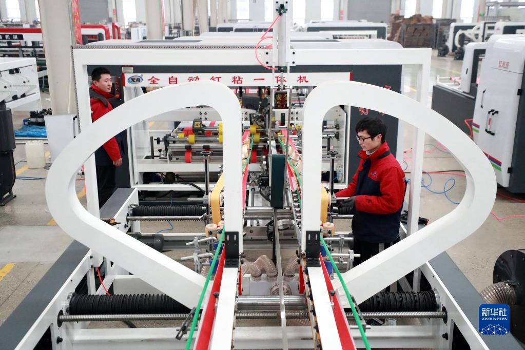 2月9日,在滄州市東光縣一紙箱設備制造車(chē)間,工作人員在調試全自動(dòng)智能釘箱聯(lián)動(dòng)線(xiàn)設備。