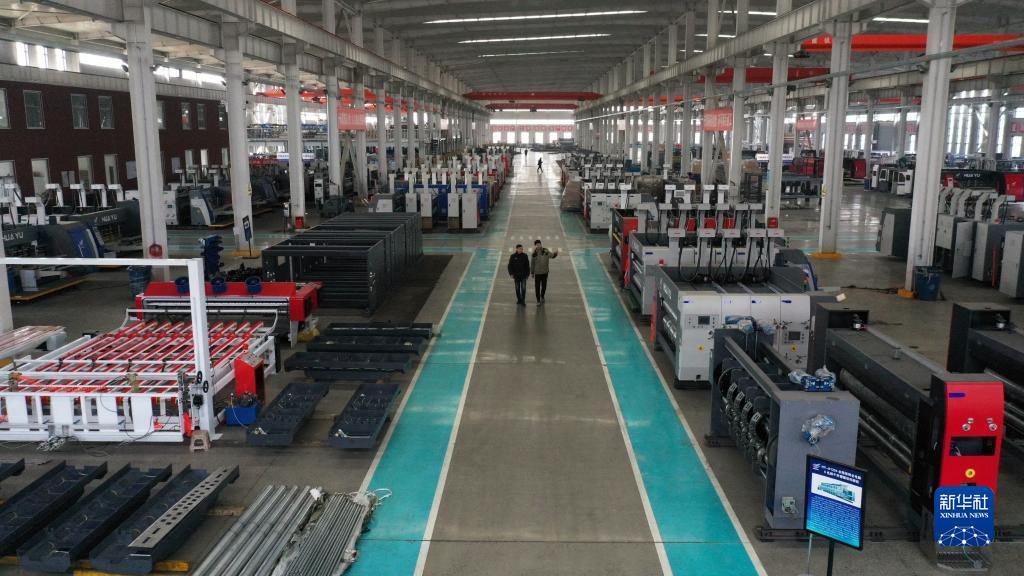 這是2月9日拍攝的滄州市東光縣一紙箱機械設備生產(chǎn)車(chē)間(無(wú)人機照片)。