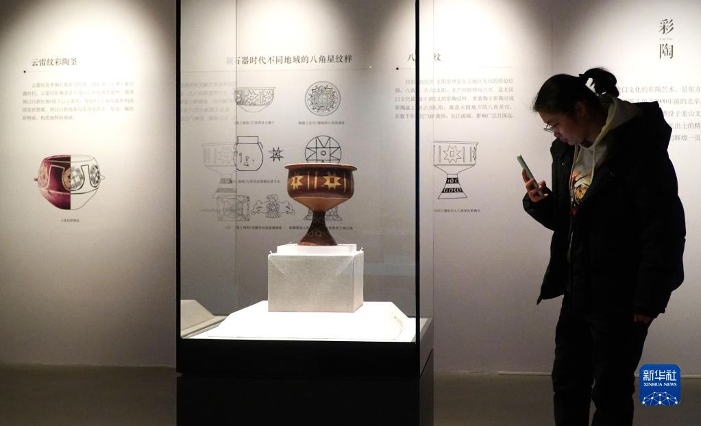 2月9日,在孔子博物館舉行的山東文物精品展上,參觀(guān)者在觀(guān)看山東省文物考古研究院收藏的大汶口文化八角星紋彩陶豆。