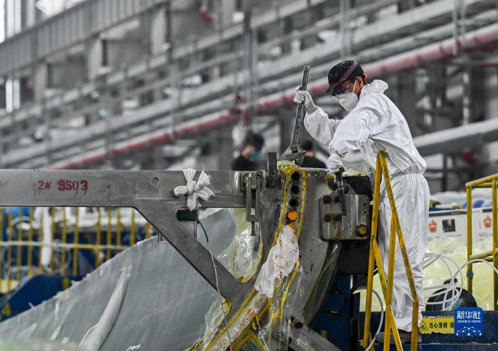2月9日,在內蒙古烏蘭察布市遠景北方能源有限公司,工人在風(fēng)機葉片生產(chǎn)線(xiàn)上工作。