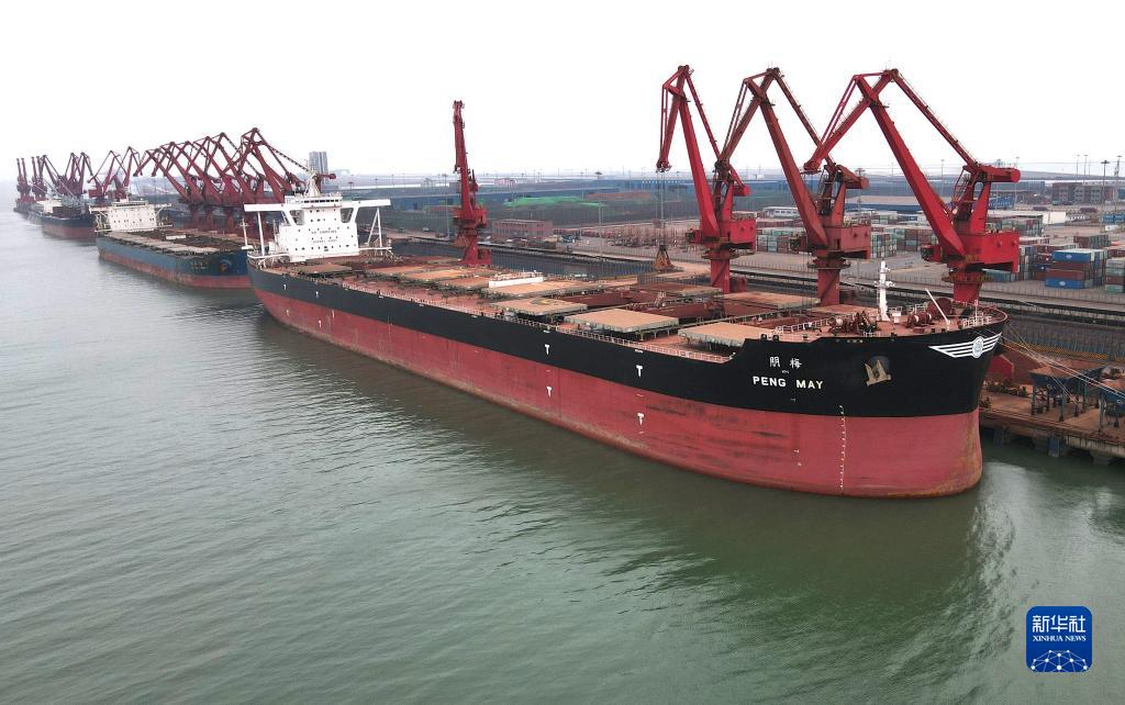 2月9日,滿(mǎn)載鋁礬土的貨船??吭邳S驊港礦石碼頭卸貨(無(wú)人機照片)。
