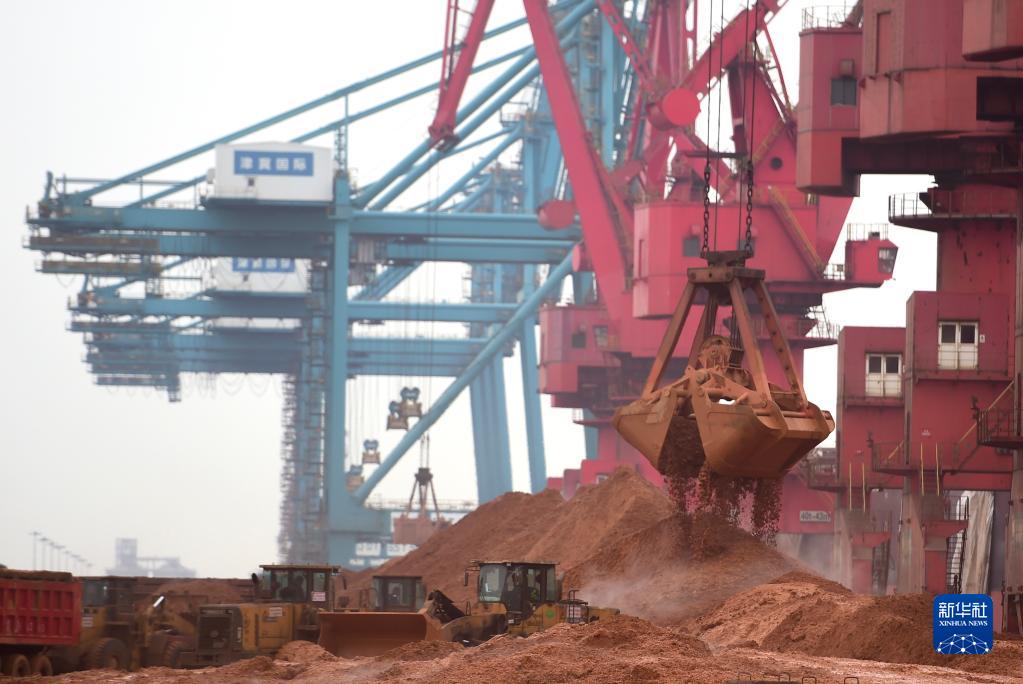 2月9日,卸船機在黃驊港礦石碼頭卸載鐵礦粉。