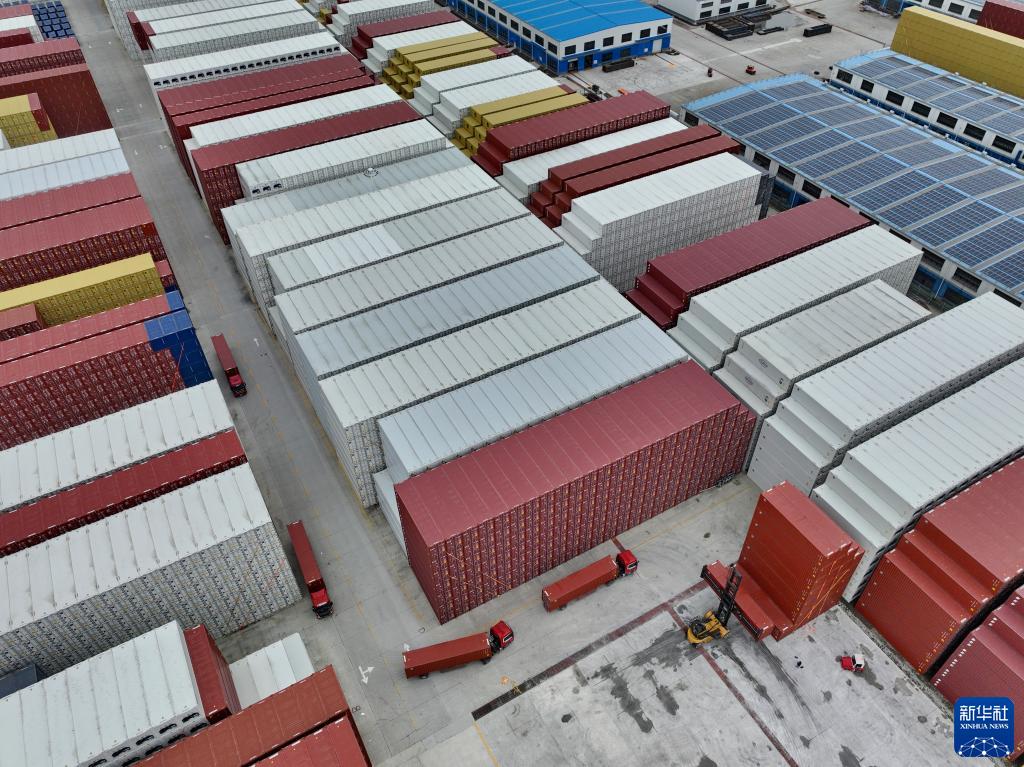 在啟東海工船舶工業(yè)園拍攝的集裝箱內部轉運作業(yè)現場(chǎng)(2月8日攝,無(wú)人機照片)。
