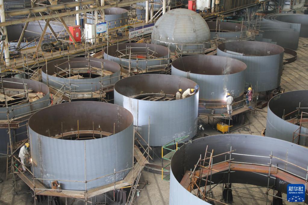 在位于江蘇省啟東市的一液罐生產(chǎn)車(chē)間內,工人在進(jìn)行液罐筒節制作(2月8日攝)。