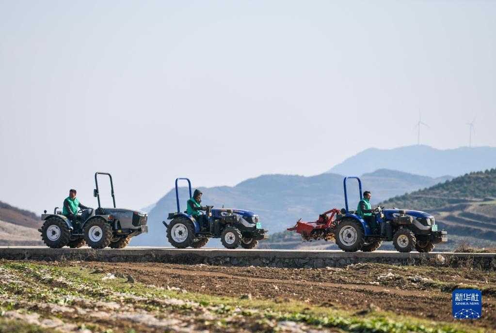2月8日,在威寧縣雙龍鎮涼山社區,農機手駕駛農機準備下鄉進(jìn)行社會(huì )化服務(wù)。