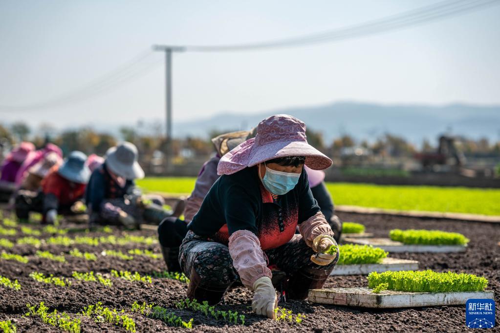 2月9日,在云南省玉溪市通??h秀山街道,農民在種植芹菜。