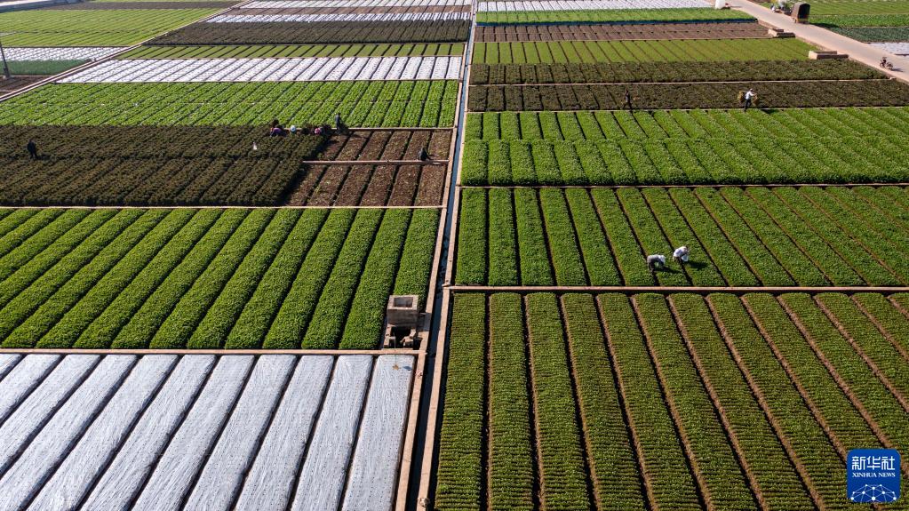 2月9日,在云南省玉溪市通??h秀山街道,農民在田間勞作(無(wú)人機照片)。