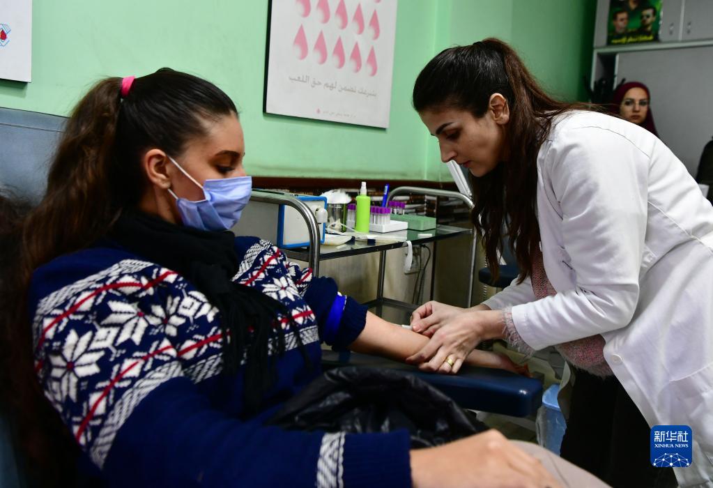 2月8日,一名女子在敘利亞首都大馬士革一處獻血中心獻血。