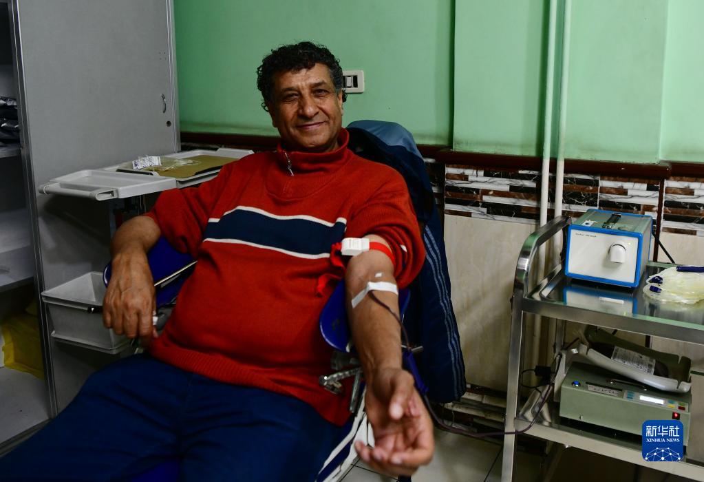 2月8日,一名男子在敘利亞首都大馬士革一處獻血中心獻血。