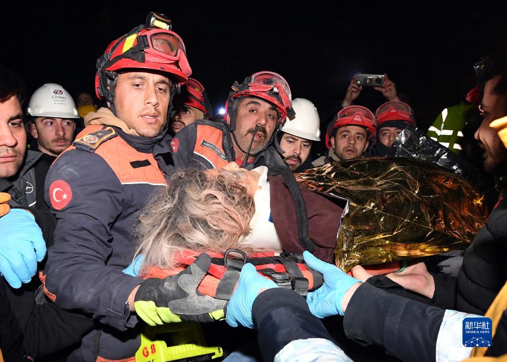2月9日晚,在土耳其哈塔伊省安塔基亞市,中國救援隊與土耳其救援隊合力營(yíng)救出的幸存者被抬出廢墟。