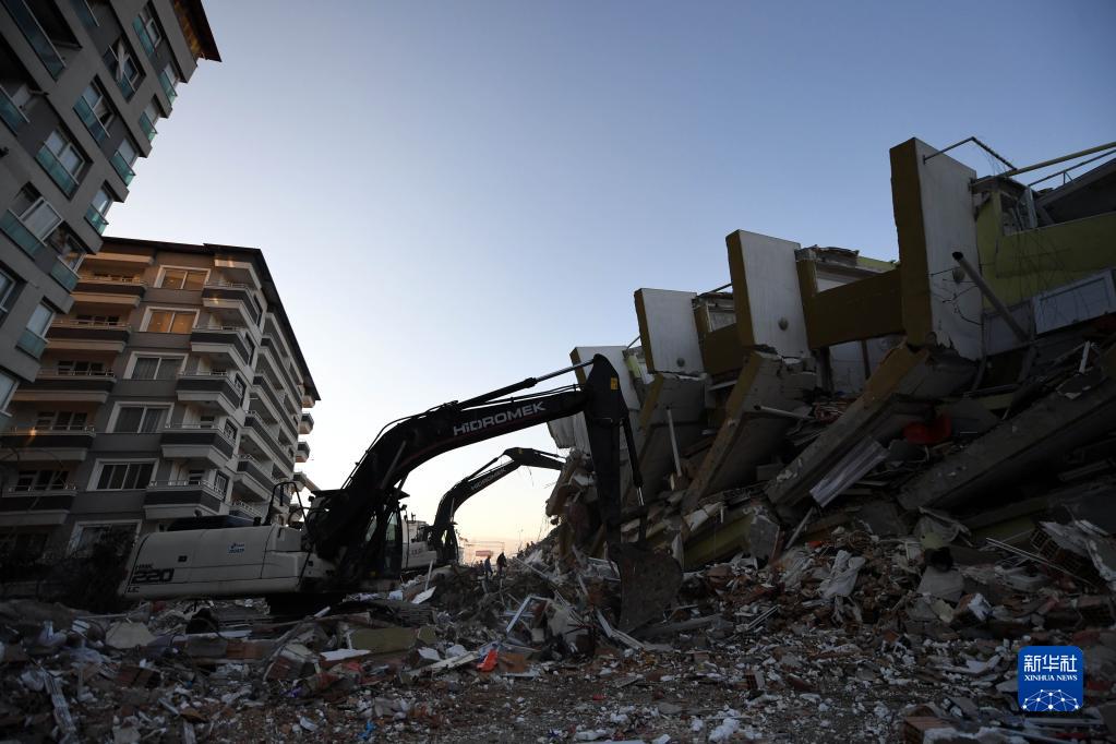 2月9日,大型機械在土耳其哈塔伊省安塔基亞市一處受損的建筑物作業(yè)。