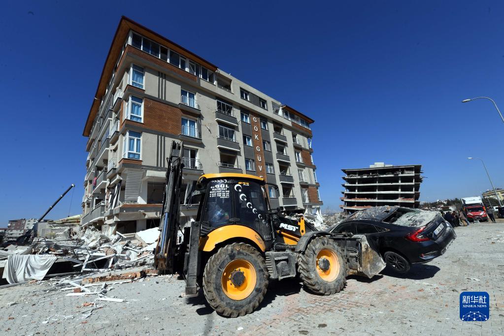 2月9日,大型機械在土耳其哈塔伊省安塔基亞市一處受損的建筑物作業(yè)。