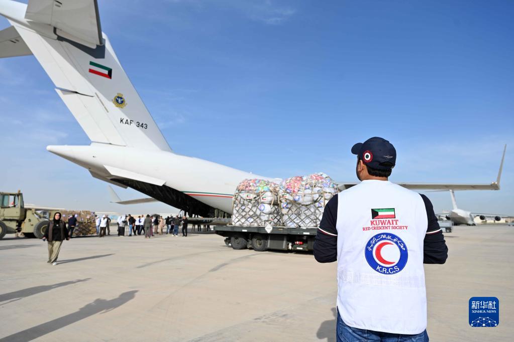 2月9日,工作人員在科威特費爾瓦尼耶省的科威特國際機場(chǎng)裝載人道主義援助物資。