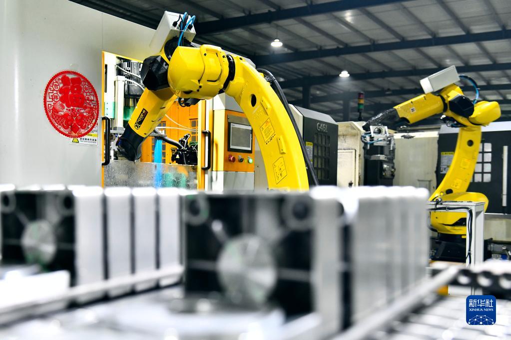 2月10日,一科技公司工業(yè)機器人在生產(chǎn)氣動(dòng)元件。