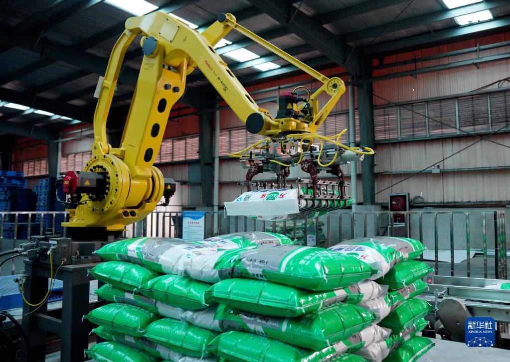 2月8日,在安陽(yáng)萬(wàn)莊公鐵物流園,機器人碼垛系統對袋裝化肥進(jìn)行碼垛作業(yè)。
