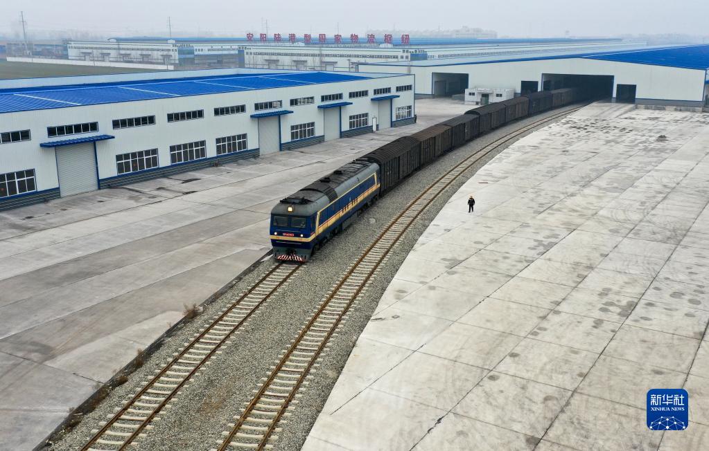 2月10日,一列裝載著(zhù)化肥的列車(chē)駛出河南萬(wàn)莊安陽(yáng)物流園(無(wú)人機照片)。