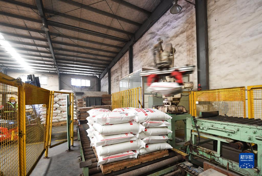 2月8日,在位于河南省商丘市寧陵縣的嘉施利(寧陵)化肥有限公司,機械臂在化肥生產(chǎn)線(xiàn)上作業(yè)。