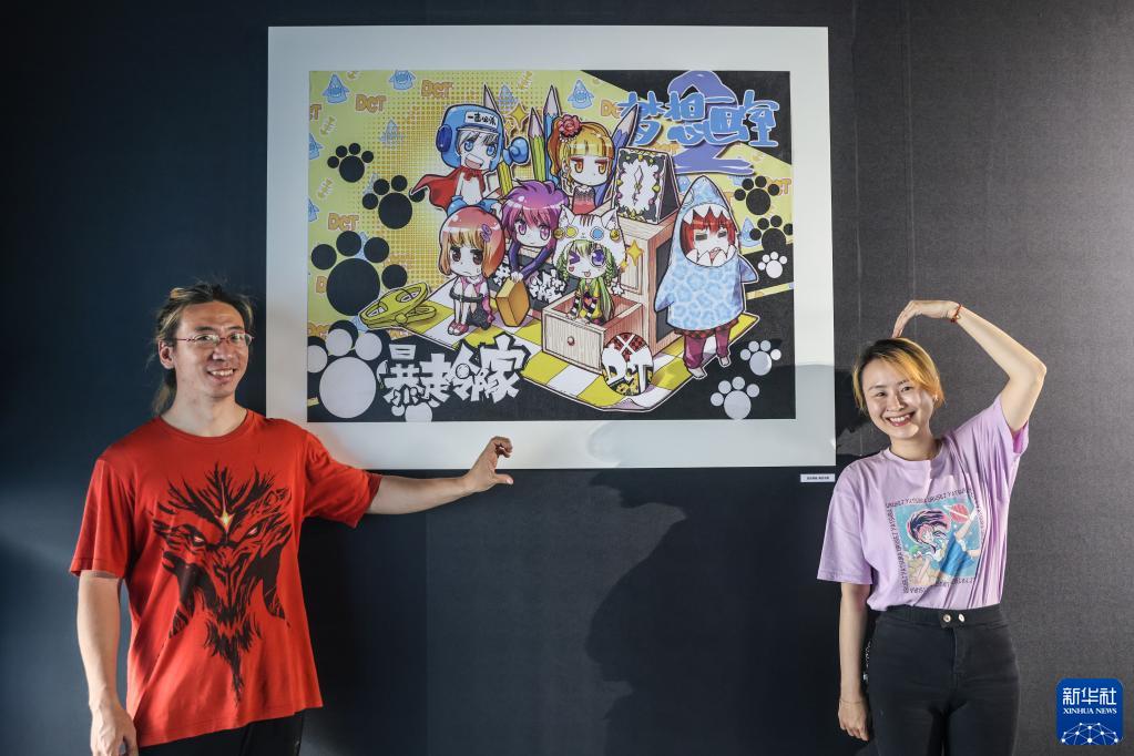 2月9日,在??谑旋垬蜴偛龑W(xué)村的“燚界·漫創(chuàng )社”創(chuàng )業(yè)孵化基地的展廳內,漫畫(huà)家“極樂(lè )鳥(niǎo)”(左)和妻子“翔”在自己的動(dòng)漫作品前合影。