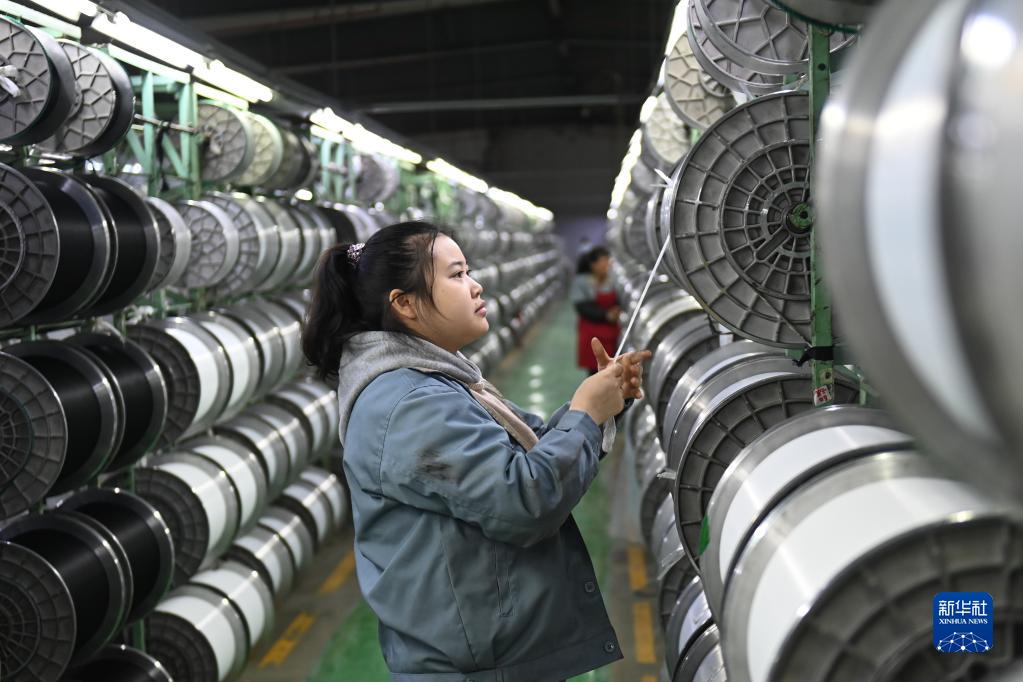 2月10日,工人在位于浙江湖州南潯區菱湖鎮的湖州領(lǐng)先絲帶有限公司織帶車(chē)間作業(yè)。