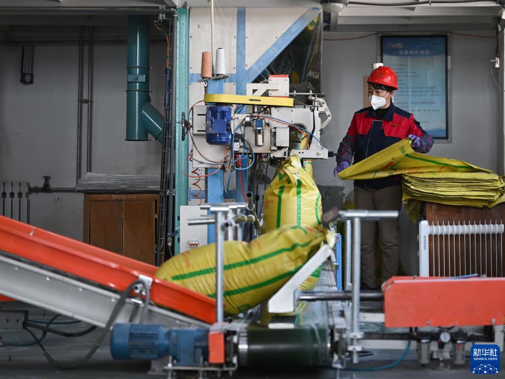 2月10日,在位于青海省海東市平安區的青海華農恒青農牧有限公司,工人打包成品飼料。