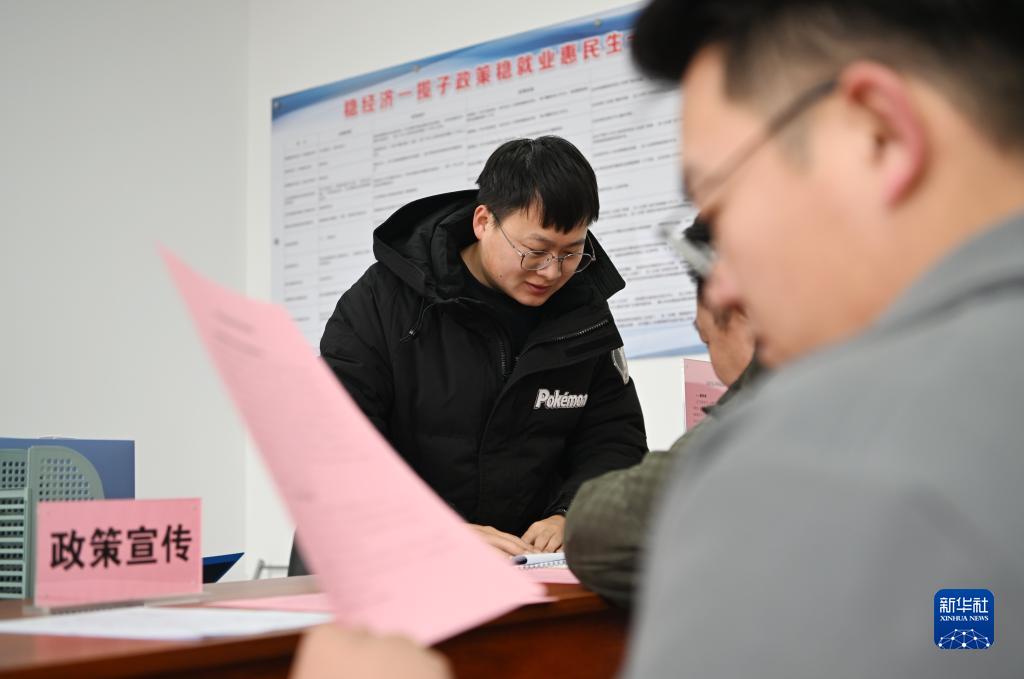 2月10日,在韓村“就業(yè)驛站”內,工作人員(左一)給村民進(jìn)行政策講解。