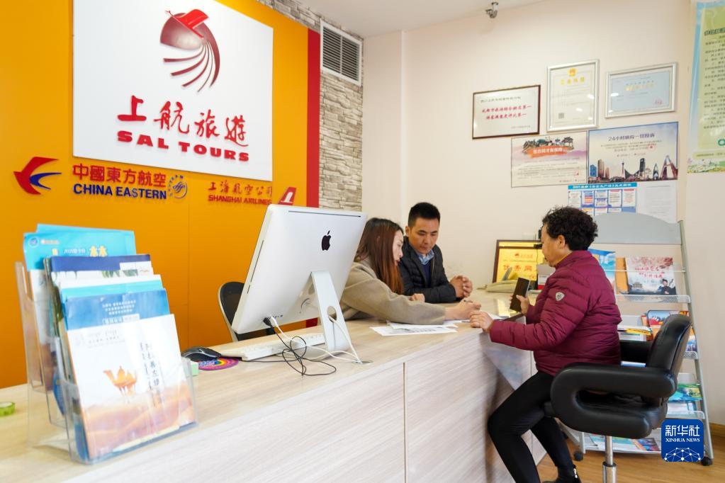 2月9日,在成都市郫都區一家旅行社,市民在咨詢(xún)出境游產(chǎn)品。