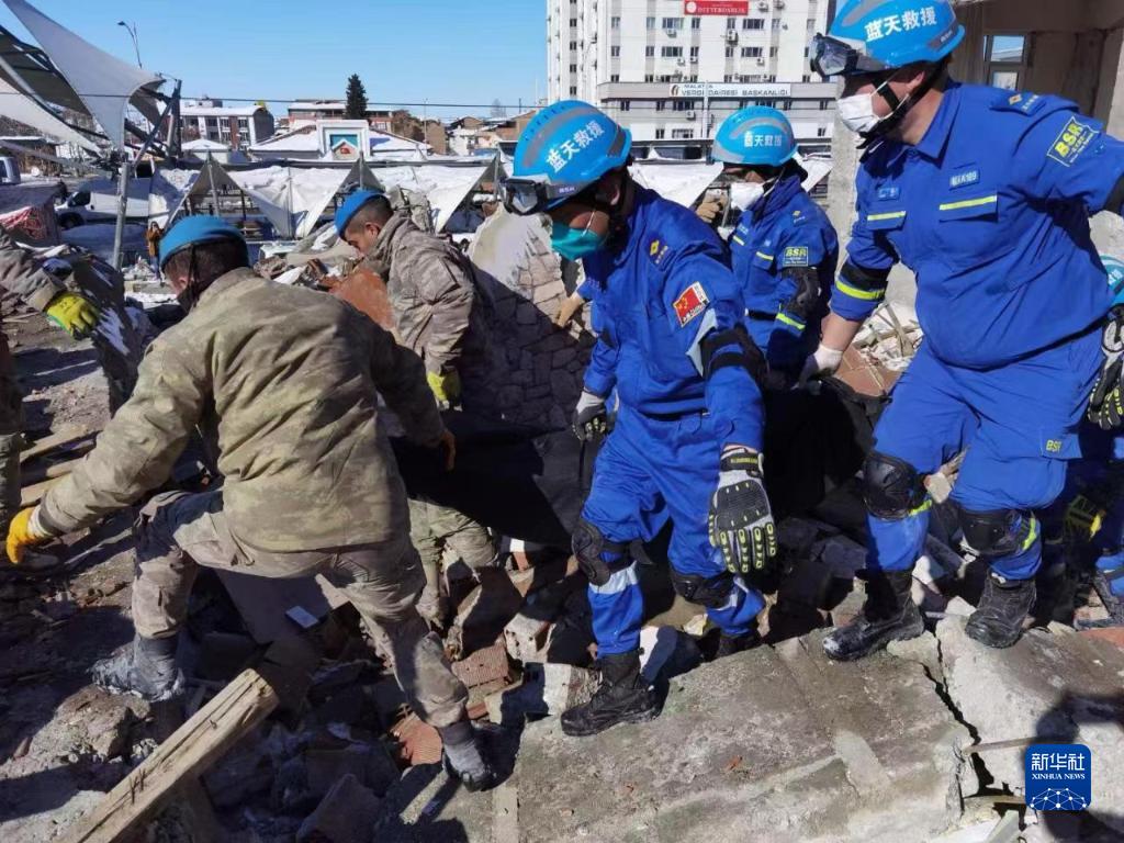 2月10日,在土耳其馬拉蒂亞省,中國藍天救援隊隊員探測到生命跡象后與當地救援人員協(xié)作開(kāi)展救援。
