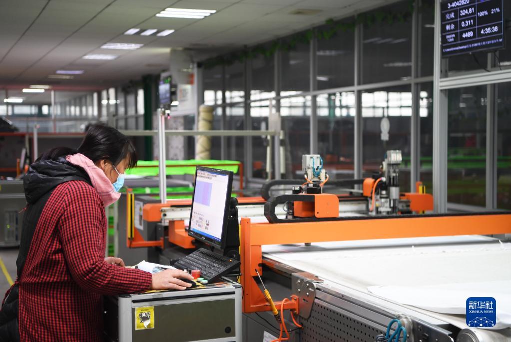 2月9日,在位于河南省商丘市睢縣的河南嘉鴻鞋業(yè)有限公司,工人在智能裁剪生產(chǎn)線(xiàn)上作業(yè)。