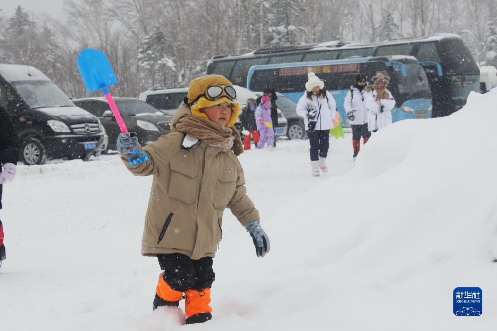 2月10日,在黑龍江大海林林業(yè)局有限公司雙峰林場(chǎng),小朋友在雪地行走。