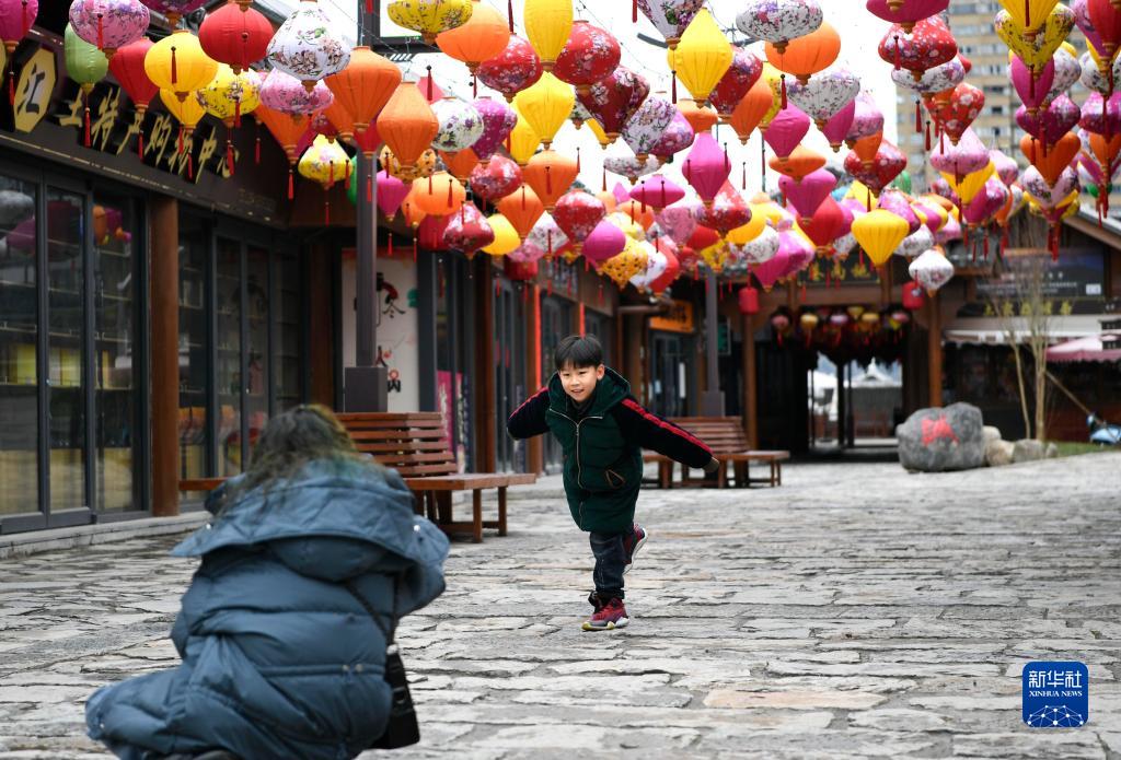 2月10日,一名小朋友在宣恩縣興隆老街的燈籠走廊下拍照。