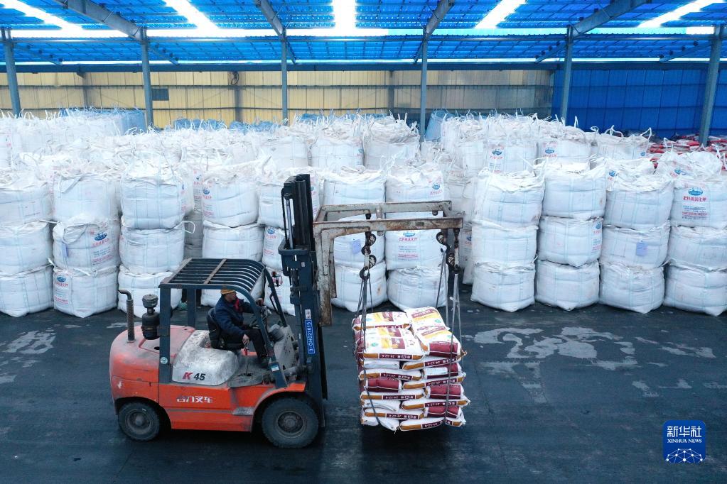 2月10日,河南省焦作市溫縣昊邦肥業(yè)職工在運送化肥(無(wú)人機照片)。